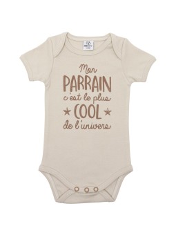 Ce body manches courtes en pur coton arbore un message empreint d’humour et de tendresse : "Mon Parrain c'est le plus cool de l'univers". Emmanchures américaines. Boutons pression à l'entrejambe.