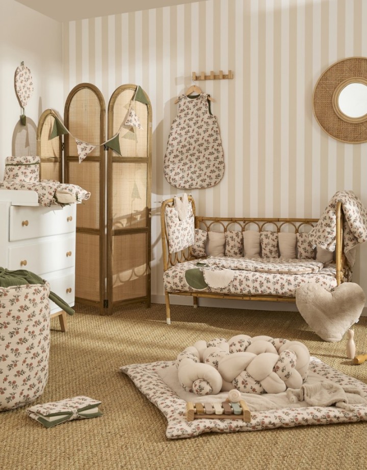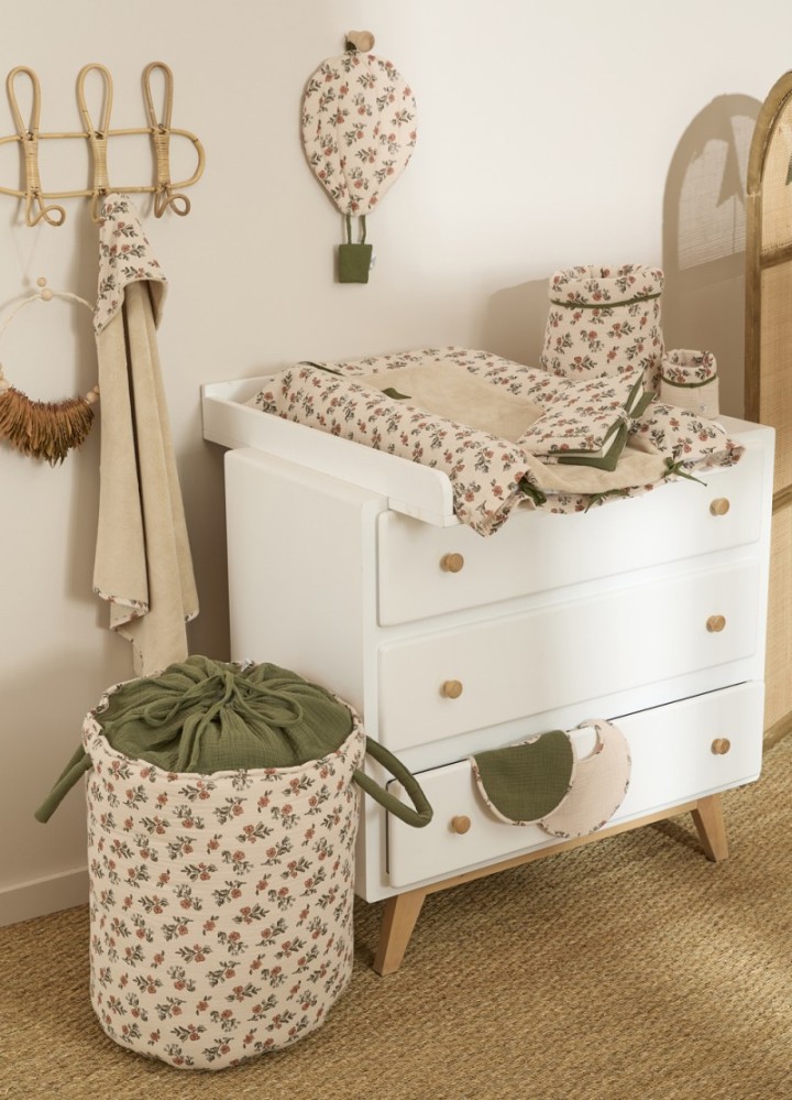 La collection "Secret Cottage" apporte un charme romantique et vintage à la chambre de bébé. Avec son imprimé floral délicat et sa palette de teintes naturelles et lumineuses, cette décoration inspirée des cottages anglais crée une atmosphère douce et chaleureuse. Mariant l'esprit rétro avec une douceur contemporaine, elle transforme chaque pièce en un écrin précieux pour les premiers souvenirs.